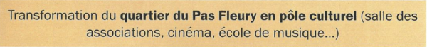 Quartier du Pas Fleury : un chantier depuis deux ans. On a vu des études onéreuses et des dessins par des bureaux d’architectes lyonnais … mais la route n’est même pas goudronnée, le bâtiment des arcades est un chantier abandonné et la salle multifonctionnelle… ce sera une toile de tente!